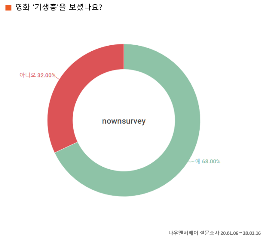 ‘영화 ‘기생충’을 보셨나요?’에 대하여 질문한 결과 ‘예 (68%)’, ‘아니오 (32%)’ 순으로 나타났다.