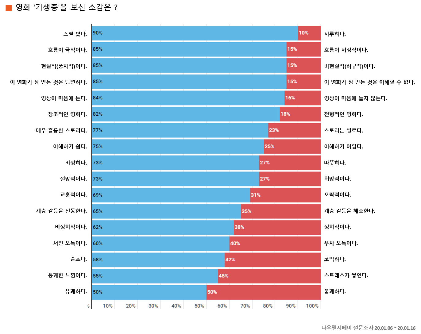 ‘기생충’ 영화를 보았다고 응답한 패널을 대상으로 ‘영화 ‘기생충’을 보신 소감은?’에 대하여 질문한 결과 이 영화는 스릴이 있으며(90%), 흐름이 극적이고(85%), 현실 풍자적(85%)이라는 평가가 TOP3에 들었다.