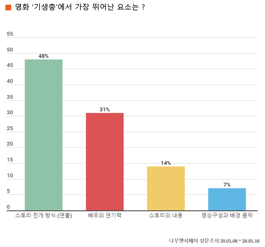 ‘영화 ‘기생충’에서 가장 뛰어난 요소는?’에 대하여 질문한 결과 ‘스토리 전개 방식 (48%)’가 많은 응답을 차지하였고, ‘배우의 연기력 (31%)’, ‘스토리의 내용 (14%)’, ‘영상구성과 배경 음악 (7%)’ 순으로 나타났다.