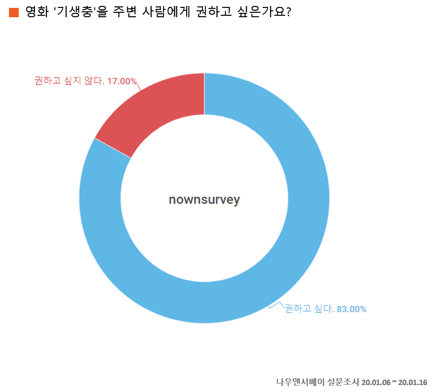 ‘영화 ‘기생충’을 주변 사람에게 권하고 싶은가요?’에 대하여 질문한 결과 ‘권하고 싶다 (83%)’, ‘권하고 싶지 않다 (17%)’ 순으로 나타났다.