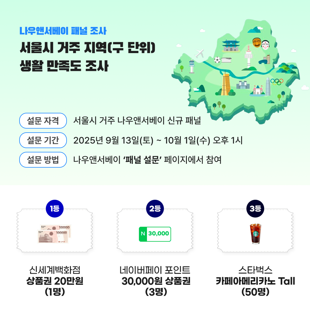 「서울시 거주 지역별(구 단위) 생활 만족도 조사」 참여 경품 이벤트 (~10/1 오후 1시)