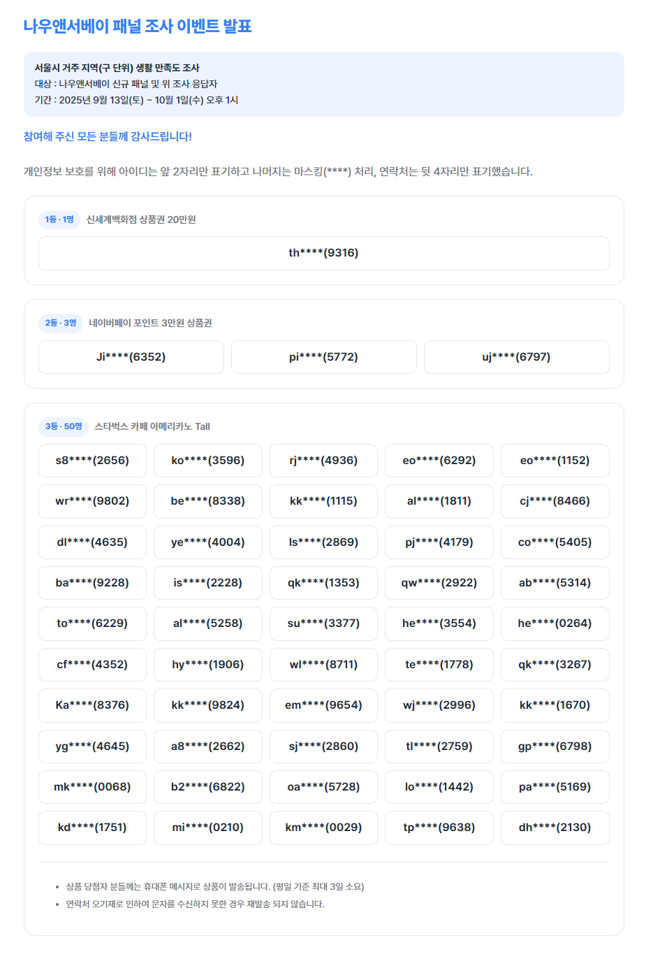 「서울시 거주 지역별(구 단위) 생활 만족도 조사」 참여 경품 이벤트 당첨자 발표