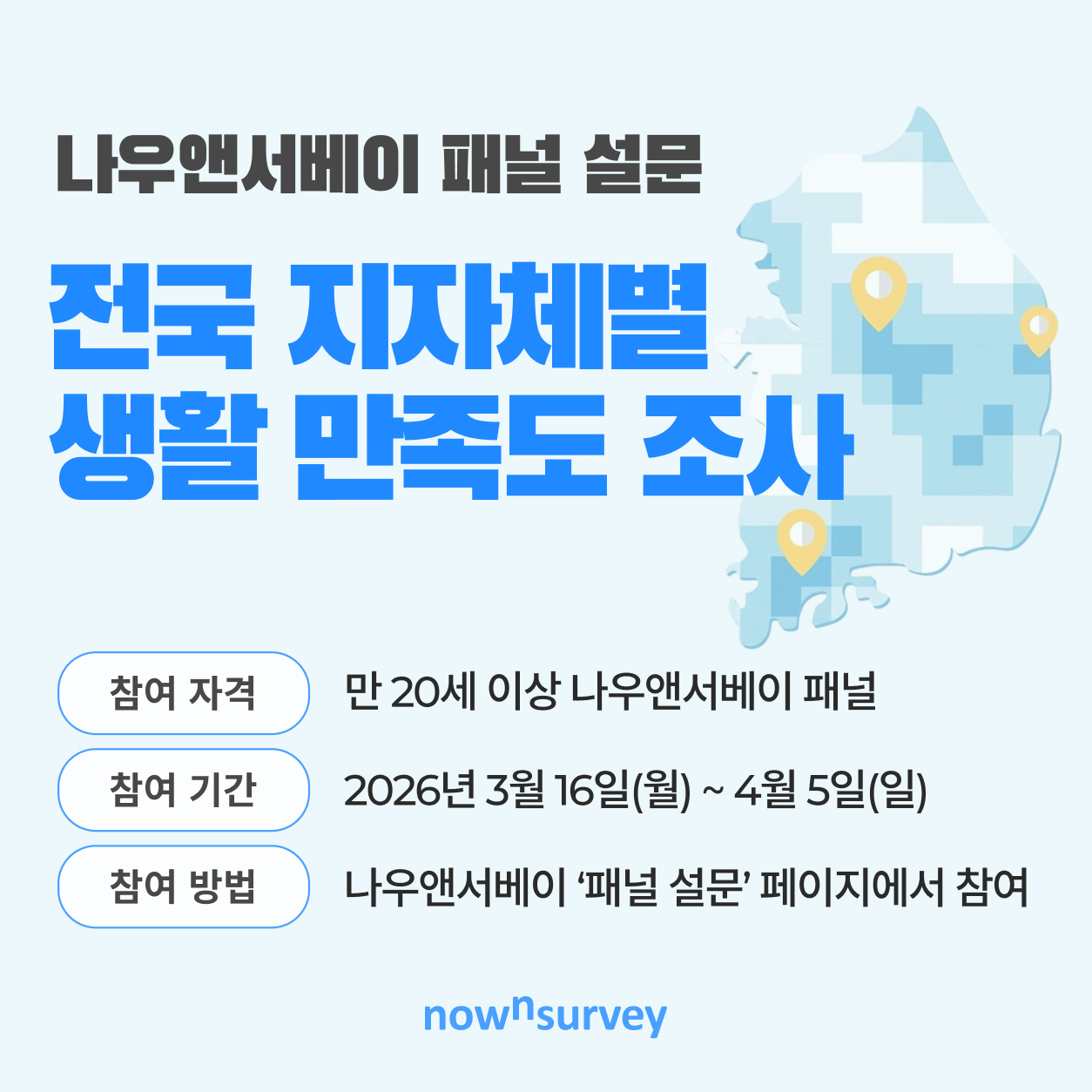 [나우앤서베이 패널 설문] '전국 광역지방자치단체(시·도)별 생활 만족도 조사' 참여 안내